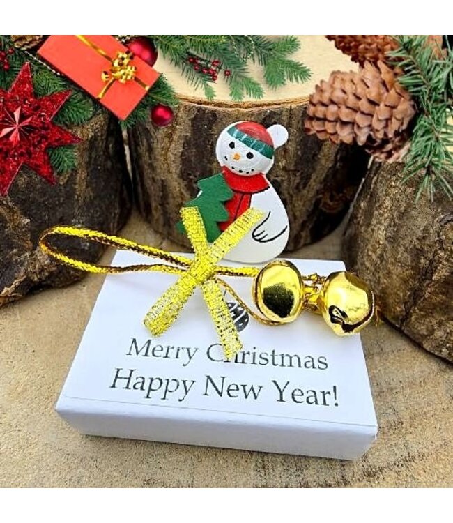 Vier de feestdagen met dit charmante wensdoosje, waarop de vrolijke boodschap "Merry Christmas Happy New Year" schittert. Het doosje, met een afmeting van ca. 5,3 x 3,5 cm, is voorzien van een houten sneeuwpop figuurtje en vrolijk rinkelende belletjes aan een koordje.